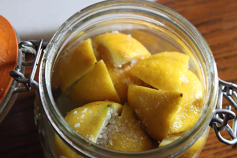 Les citrons sont conservés dans une saumure où il se produit une lacto-fermentation. On peut les acheter tous prêts dans les épiceries arabes, ou chez les vendeurs d’épices et d’olives sur les marchés, mais il est très facile de les préparer soi-même.