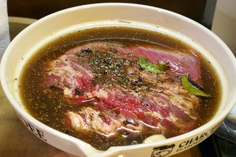 Faites bouillir l’eau, ajoutez les épices, le sel, et laissez refroidir. Versez ensuite cette saumure froide sur la viande. Elle doit être complètement recouverte. Posez dessus une planchette ou une assiette plus petite que le récipient, puis le poids, de manière à ce que la viande ne puisse pas flotter, mais soit bien maintenue immergée dans le liquide.