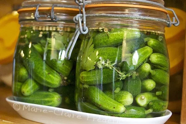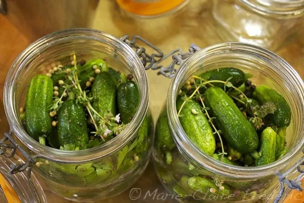 Qui auraient la particularité de raffermir les tissus. Ces tannins seront sous la forme d’une ou plusieurs feuilles de vigne, de chêne, de cassis, de cerisier. On place une feuille au fond du bocal. En suite on prie Saint Cornichon et on va faire trois génuflexions en tournant dans le sens inverse du soleil, on essaie aussi les sacrifices humains, parce que selon moi, cette cinquième consigne n’a jamais prouvé son efficacité.