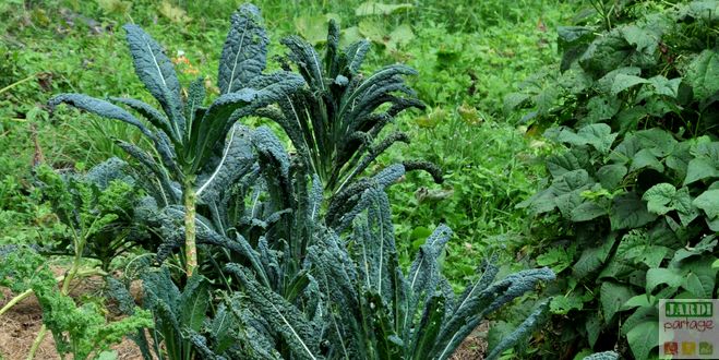 Le chou palmier « Noir de Toscane », que l’on trouve aussi sous l’appellation de Chou kale lacinato ou Nero di Toscana en italien, est une vieille variété, la plus cultivée. Ses feuilles vert sombre, presque noires avec le froid, sont très belles. N’hésitez pas à l’utiliser comme plante d’ornement dans les massifs.