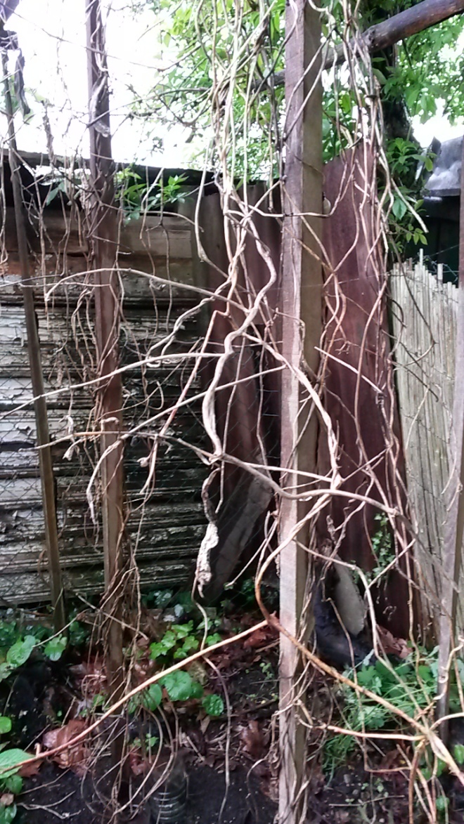 Aspect de la partie aérienne morte après l’hiver, qu’il vaut mieux conserver en place afin de faciliter l’escalade des nouvelles pousses :