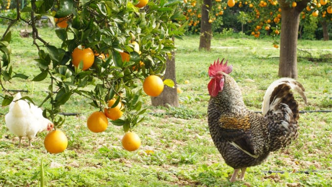 Avec ses déjections, la poule va sur le long terme enrichir le sol, ajouter de la matière organique qui sera absorbée par l’arbre pour lui permettre de produire les fruits. Soit.