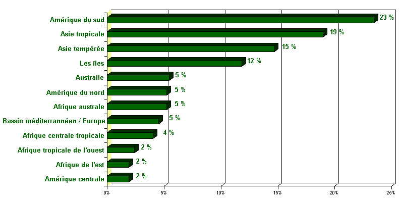 On dénombre dans le monde environ 400.000 espèces de végétaux dont 230.000 plantes à fleur (les autres étant les champignons, mousses, lichens, algues,...). La répartition de ces plantes à fleur est la suivante :