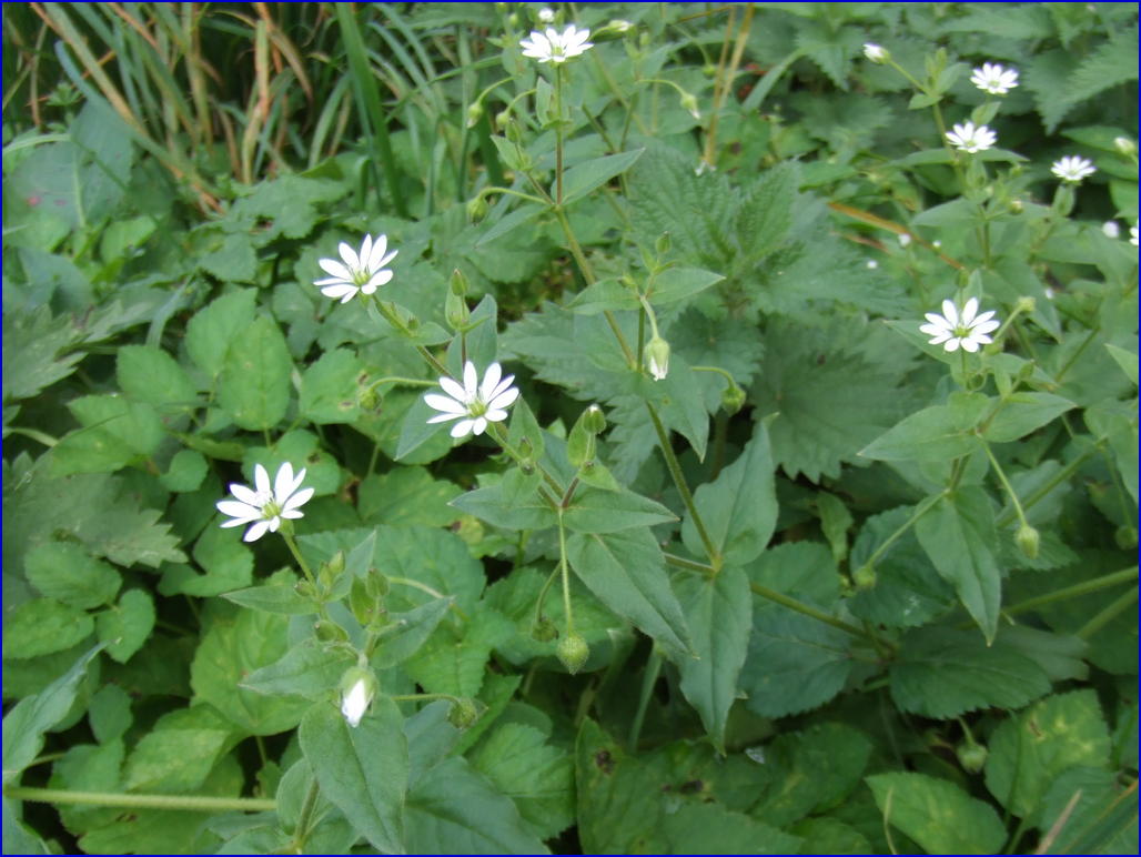 common chickweed ; winterweed ; starwort ; chickweed ; nodding chickweed ; stellaria ; centocchio comune ; herba gallina ; morso di gallina ; paperina comune ; peverina ; santon ; canta gaine ; erba canaina ; álsine ; pamplina ; hierba pamplina ; estrellita ; hierba de los canarios ; hierba gallina ; hierba pajarera ; hierba roquera ; maruja ; ojo de gringo ; morgeline ; stellaire moyenne ; mouron des oiseaux ; mouron blanc ; bec-de-moineau ; herbe à l'oiseau ; Vogelmiere ; Gewöhnliche Vogelmiere ; Vogelmeier ; Vogel-Sternmiere ; Hühnerdarm ; Mäusedarm ; gleiz ; morró ; morró comú ; herba cloquera ; almindelig fuglegræs ; vogelmuur ; muur ; ganzemuur ; stelario meza ; pihatähtimö ; στελλάρια ; haugarfi ; Stellaria media ; Alsina media ; killoikilloi ; vassarve ; morugem-branca ; agrião-dos-prados ; esparguta ; våtarv ; gwlydd y cywion ; gwlydd yr ieir ; gwlydd y dom