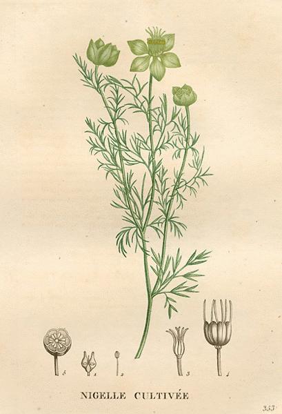 Nigelle des champs (cumin noir) est une plante cultivée annuelle qui peut atteindre 60 cm de hauteur dont on utilise les graines, et l'huile produite à partir des graines. Traditionellement considérée comme une panacée dans le monde arabe, elle stimule le système immunitaire, elle est efficace contre les infections des voies respiratoires, les allergies, la toux, le rhume, la bronchite, la fièvre, la grippe, les maux de tête, l'asthme , les coliques, douleurs d'estomac, la dermatite, l'eczéma, les rhumatismes, utile pour donner du lait aux nourices etc... En tisane : 1 à 2 c. à café par tasse d'eau. Placer les graines dans l'eau, porter à ébullition pour quelques secondes, retirer du feu et laisser infuser de 5 à 10 minutes. Pour des cures de trois mois prendre 1 à 3 cuillères à café, pures ou avec du miel, ou du lait ou tout autre aliment au cours du repas. En usage externe : Huile de graines nigelle pour traiter les problèmes de peau. En cuisine on utilise la nigelle comme condiment, de la même manière que l'on utilise le cumin. On réduit les graines en poudre ou on les utilise entières. (Voir aussi Les bienfaits de la nigelle)
