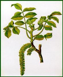Arbre des terrains sableux dont on utilise les feuilles. Le noyer est à la fois dépuratif tonique et astringent. Egalement : Rachitisme, maladies osseuses, dyseptie, atonie digestive, nausée, diabète, diarrhée, leucorrhées, angine, anémie. Et en usage externe : Impétigo, abcès, ulcères, plaies, engelures, chute des cheveux , conjonctivite. Une poignée par litre d'eau bouillante laisser infuser 10 minutes boire à volonté. Décoction de 50 g pour un litre d'eau en lotion et compresses sur abcès, ulcères, plaies, engelures, chute des cheveux. Vin de brou de noix : Faire macérer pendant trois mois 500 g d'écorce de noix verte dans un litre d'eau-de-vie, filtrer, rajouter 3 litres de vin, sucrer, un verre avant les repas.
