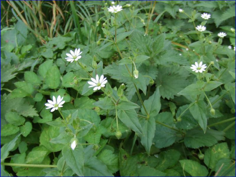 common chickweed ; winterweed ; starwort ; chickweed ; nodding chickweed ; stellaria ; centocchio comune ; herba gallina ; morso di gallina ; paperina comune ; peverina ; santon ; canta gaine ; erba canaina ; álsine ; pamplina ; hierba pamplina ; estrellita ; hierba de los canarios ; hierba gallina ; hierba pajarera ; hierba roquera ; maruja ; ojo de gringo ; morgeline ; stellaire moyenne ; mouron des oiseaux ; mouron blanc ; bec-de-moineau ; herbe à l'oiseau ; Vogelmiere ; Gewöhnliche Vogelmiere ; Vogelmeier ; Vogel-Sternmiere ; Hühnerdarm ; Mäusedarm ; gleiz ; morró ; morró comú ; herba cloquera ; almindelig fuglegræs ; vogelmuur ; muur ; ganzemuur ; stelario meza ; pihatähtimö ; στελλάρια ; haugarfi ; Stellaria media ; Alsina media ; killoikilloi ; vassarve ; morugem-branca ; agrião-dos-prados ; esparguta ; våtarv ; gwlydd y cywion ; gwlydd yr ieir ; gwlydd y dom