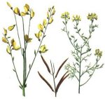 Le genêt passe pour être une ancienne plante tinctoriale utilisée dès l'Antiquité. Si le genêt à balais donne des jaunes et même des verts (le vert de la tapisserie de Bayeux passe pour être un vert tiré du genêt), il existe une autre espèce de genêt, le genêt des teinturiers, aux fleurs plus petites qui donne un superbe jaune d'or sur la laine. | jaunes et vert |