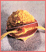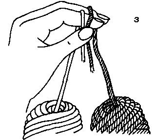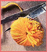 Attention: couper net, sans échelles...3 ... puis glisser entre les deux cartons, une laine mise en double ou triple (il faut qu'elle soit très solide) et la nouer très serré, après l'avoir fait glisser jusqu'au centre du pompon, à la pliure du milieu des brins coupés. Ôter les cartons. 4. Égaliser les brins, secouer le pompon pour lui donner du gonflant.