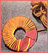 Dans un carton souple, couper deux ronds d'un diamètre égal à celui de la sphère désirée plus 1.5 cm. Évider le centre d'environ le 1/3 du diamètre et fendre de bord à bord. Superposer ces 2 ronds.