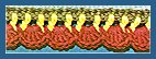 3ème rg: Prendre le fil rouge et faire 1 m.c. dans la 1ère m.s. passée au rg précéd. 3 m. chaîn. et en trav. derrière les arceaux du rg précéd., faire dans les m.s. passées du rg précéd., 2 br. dans la m.s. suiv., 1 br. ans la m.s. suiv., *1 br. dans la m.s. suiv., 2 br. ans la m.s. suiv., 1 br. dans la m.s. suiv.* Rép. de * à *, faire 1 br. dans la même m. que dernière br. Casser le fil et arrêter. Ne pas tourner.