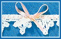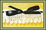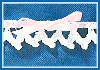 3ème rg: 7 m. chaîn., puis faire 1 m.s. dans ch. des 4 m.s. du rg précédent. Tourner. Rép. les 2ème et 3ème rgs jusqu'à la longueur désirée en term. avec 3ème rg. Tourner et trav. sur le bord, côté petits festons (3 m. chaîn.) ainsi: 1 m.s. dans le 1er feston, *4 m. chaîn., 1 m.s. dans le feston suivant*. Rép. de * à *. Arrêter. Passer le ruban dans le dernier rang.