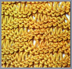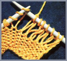 Ce point peut être tricoté en association avec du point de jersey, ou avec du point de jarretière pour faire une bande de tricot ajouré, mais on peut également l'employer seul pour réaliser des ouvrages demandant de la légèreté (écharpes, liseuses, etc...). Commencer par un rang à l'endroit et, à chaque maille enrouler le fil trois fois autour de l'aiguille (voir ci-haut). Au rang suivant, tricoter ces mailles à l'endroit ou à l'envers selon les besoins du point, en laissant glisser les 3 boucles supplémentaires de chaque maille (voir ci-haut)