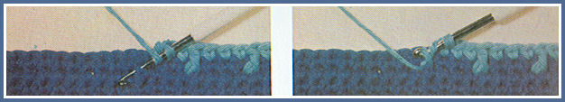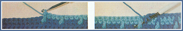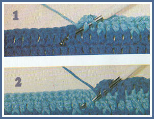 1. Faire 1 jeté sur le crochet, puis le piquer, de l'endroit sur l'envers, à droite de la m.s. correspondante de l'avant-dernier rg et le ressortir, de l'envers sur l'endroit, à gauche de cette même m.s. 2. Faire 1 autre jeté sur le crochet et le tirer en boucle ressortie à droite de la m.s. Il y a ainsi, sur le crochet: la boucle tirée, le 1er jeté et la boucle du début.