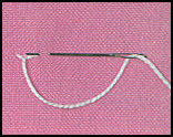1. Sortir l'aiguille sur l'endroit: la piquer à droite, à la distance désirée, la ressortir à gauche, à mi-distance. 2. Faire les points suivants de la même manière, mais en ressortant l'aiguille au-dessus du fil, très près de l'entrée du point précédent. 3. Ne pas trop tirer sur le fil, lui laisser une certaine souplesse, sans pour autant qu'il forme des boucles.