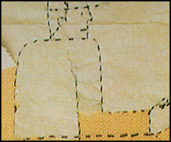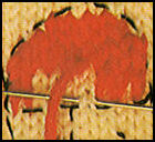 Broder le contour de chaque partie du motif de couleur différente, par une maille faite à l'aiguille et recouvrant exactement une maille du tricot, comme l'explique le tableau ci-haut. Puis broder l'intérieur à grandes mailles, en recouvrant avec une seule maille brodée deux mailles (ou plus) en largeur et trois rangs (ou plus) en hauteur, selon l'importance de la surface à recouvrir. Terminer en sertissant les contours de chaque partie du motif de couleur différente, par un point de tige (voir explication plus bas) fait sur les points devant ayant servi à silhouetter le dessin. Mailles verticales de haut en bas: