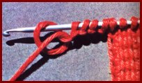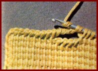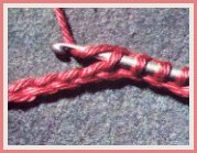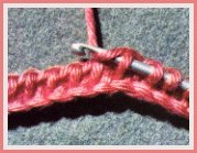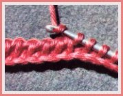 Piquer le crochet dans la 1ère m.s. libre du rg précédent, faire 1 jeté sur le crochet et le tirer en boucle au travers de la m.s.; garder la boucle sur le crochet et ainsi de suite dans toutes les m. du rg précédent, sans en passer aucune. À la fin du rang de m.s., sans tourner le travail, faire 1 jeté sur le crochet et le passer au travers de la première boucle seulement, pour la fermer. Continuer en faisant 1 jeté sur le crochet et en le passant au travers des deux premières boucles. Couler les boucles 2 par 2, jusqu'à ce que toutes soient fermées. Pour tous les autres "allers", glisser le crochet de droite à gauche, sous le brin vertical de chaque boucle relevée à l'aller et coulée au retour du rang précédent, faire 1 jeté, le tirer en boucle sous ce brin et garder la boucle sur le crochet. Fermer les boucles, au retour, comme l'expliquent la photo et la légende 3.