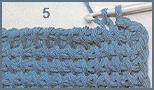 5ème rg: 1 m. chaîn., piquer le crochet sous le 2ème brin vertical sui., 1 jeté, tirer 1 boucle, puis relever 1 m. dans ch. des 2 m. suiv., en piquant toujours le crochet, d'abord dans la 2ème des 2 m., puis dans la 1ère. Répéter jusqu'à la fin du rang.