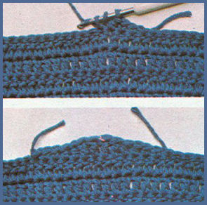 2ème rg: comme le 1er rg, mais plus long. Commencer et terminer à 3 m. d'écart du rg précédent, ce qui augmente de 6 m. celles du milieu (3 de chaque côté), travaillées dans le point du modèle. Casser le fil. Continuer le travail normalement, jusqu'à la prochaine demi-lune.