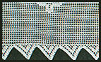 Chaque dent mesure environ 15 cm sur le biais de son côté gauche. Les points employés sont des brides, ouvertes ou fermées, et des mailles en l'air formant un jour carré. Cette dentelle a été conçue exprès pour venir compléter la grille du fond et le motif en losange travaillé au point de brides. La dentelle est réalisée à part pour être ensuite cousue au bs du rideau.