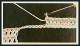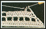 - ... 1 br. dans chacune des 2 premières br. du 8ème rg de la dent précédente, puis 1 br. ouverte dans chacune des 2 br. suivantes et couler les 3 boucles en 1 fois. Terminer par 3 m.a. et tourner. Le 1er rg de la dent suivante est terminé.