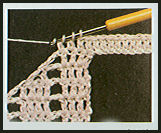 3ème rg: passer la 1ère br. du bord faite dans le petit arceau de l'avant-dernier rg, et faire 1 br. dans chacune des 3 br. suivantes, puis 2 m.a., passer les 2 m.a. correspondantes du rg précédent et faire 4 fs : *1 br. dans la 1ère br. libre qui se présente et 2 br. dans le jour qui suit,*; terminer par 1 br. ouverte dans l'avant-dernière br. du rg précédent, puis piquer le crochet dans la dernière br. du rg précédent, faire 1 jeté et le tirer en boucle au travers de cette br., 1 autre jeté pour couler la boucle tirée, la br. ouverte et la boucle qui était sur le crochet (= couler les 3 boucles du crochet en 1 fois); 3 m.a. et tourner.
