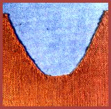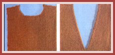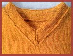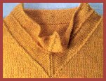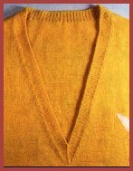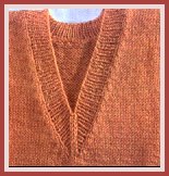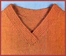 Cette encolure n'est pas en pointe: elle a, au milieu du devant, une partie droite. Deux méthodes sont employées, selon que l'on tricote la bordure remmaillée à même, autour de l'encolure, ou bien que l'on tricote à part une bande à coudre ensuite.
