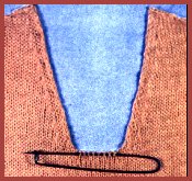 Remmailler les bords de chaque devant et du dos, comme pour toute autre encolure, mais en partant de la pointe du milieu, pour remonter le long du bord du devant droit; puis à la suite, remmailler le dos et enfin le bord du devant gauche. Travailler en rang aller et retour, et non en rond, dans un point ne roulant pas (sur le croquis, le point mousse est utilisé). Tricoter une bande droite, de la hauteur nécessaire, et rabattre.