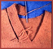 Les deux côtés du devant terminés et la couture des épaules piquée, faire la finition d'encolure. Reprendre sur les aiguilles appropriées, pour la bordure, les mailles laissées en attente au milieu devant.