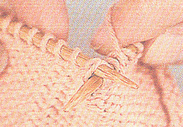 - Tricotez jusqu'à l'endroit voulu, et écartez légèrement les aiguilles. Insérez la pointe de l'aiguille droit sous le fil horizontal que vous voyez apparaître entre les premières mailles de chaque aiguille.