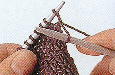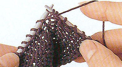 Lâchez l'ancienne maille.Augm. bar. sur l'envers: Il s'agit de la même méthode que pour l'augmentation barrée sur l'endroit, mais vous tricotez la maille à l'envers, avec le fil sur le devant de l'ouvrage.