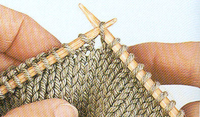 Il est parfois utile d'augmenter de plusieurs mailles au même endroit. Pour ce faire, insérez l'aiguille droite entre les deux premières mailles de l'aiguille gauche, puis montez le nombre de mailles nécessaires selon technique du montage à deux aiguilles.