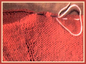 - Sur la couture de gauche, où doit se fixer la fermeture, rab. les mailles lisière (2 ou 3) pour former un cran qui permettra de plier le rentré de la fente plus facilement.