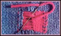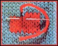 Piquer l'aiguille de droite à gauche sous les 2 brins de la maille qui se trouve directement au-dessus de celle qui est à couvrir, et tirer le fil à travers. Piquer l'aiguille à nouveau à la base de la maille d'où le fil a été sorti vers l'endroit du travail, et tirer le fil à travers. Ne pas trop tirer le fil en le passant à travers les mailles sinon le tricot original froncera, et la nouvelle maille ne couvrira pas bien l'ancienne. Continuer ainsi jusqu'à ce toutes les mailles qui ont besoin de renfort soient recouvertes.