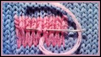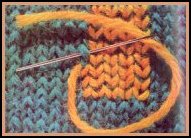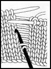 L'endroit du travail vers soi, piquer le crochet dans la maille à rattraper. Soulever le 1er brin avec le crochet, en le laissant avant la maille déjà sur le crochet, puis, le tirer doucement à travers la maille. Cette maille tombe du crochet, et le brin devient la nouvelle maille. Répéter jusqu'à ce que tous les brins aient été repris, puis remettre la maille sur l'aiguille. Sur du jersey envers, remonter la maille sur l'envers du travail, c'est-à-dire, sur les mailles endroit.