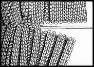 Sur ces photos, les échantillons ont été travaillés avec des fils de couleurs différentes afin de mieux montrer les diverses méthodes de travail; ce raccommodage se fait avec un fil de la même couleur que le tricot: il sera presque invisible si les mailles qui le constituent sont faites comme des mailles de tricot.