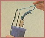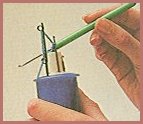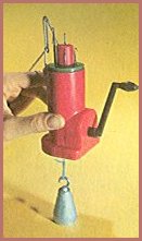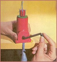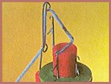 Premièrement, passer le fil dans l'oeillet inférieur, puis dans l'oeillet supérieur de la tige fixe; lui faire traverser le tube central. Faire un noeud à l'extrémité et y fixer le poids. Travailler les aiguilles à clapets ouverts. Maintenir de la main gauche le fil venant de la pelote. Au 1er tour il faut que seules 2 aiguilles en vis-à-vis prennent le fil: pour cela faire passer le fil par-dessus la tête des 2 autres. Le 1er tour terminé, faire tourner la manivelle pour que chacune des aiguilles forme successivement sa maille. Remonter régulièrement le poids pour faciliter le glissement du travail. Si une aiguille manque le fil à un passage, la maille ne se forme pas et celle qui est sur l'aiguille tombe sans être tricotée. Pour rattraper la maille filée, ôter d'abord le poids, puis remonter le tubulaire et le défaire jusqu'au rang au-dessous de la maille perdu; remettre chaque maille sur une aiguille à l'aide d'un crochet. Replacer le poids; continuer le travail en tournant la manivelle. L'assemblage se fait au point de surjet, sur l'envers de l'ouvrage, quel que soit le motif.