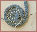 - Pour ce faire il s'agit, à l'aide du crochet, de passer la laine du premier rang par-dessus celle du deuxième rang et ainsi de suite jusqu'à ce que les deux côtés du tricotin soient terminés.