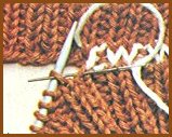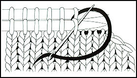 Pour le jersey envers: les mailles sont reprises par un va-et-vient réalisé de bas en haut, sens de l'aiguille, puis de haut en bas, sens de la flèche. (Voir dessin)