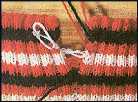Lorsque les bords sont prêts à être rapprochés, couper le fil en laissant 3 ou 4 fois la longueur du rang de grafting et l'enfiler dans un passe-lacet. Il est évident que ces points doivent être, en fait, invisibles et donc réalisés ton sur ton. Sur les illustrations vous verrez ce travail fait sans aiguille à tricoter. Certaines tricoteuses opèrent de la sorte, mais cela comporte le danger de laisser tomber une ou plusieurs mailles. À faire attention.