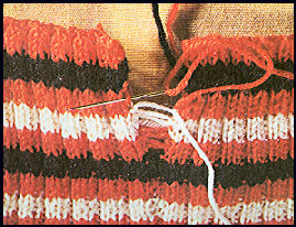 Vous pouvez passer le fil entre "les deux premières mailles" cette méthode est plus rapide pour assembler de longues pièces ou bien une à une alternativement à chaque rang lorsque les pièces à assembler sont petites ou que le tricot est lâche. Si les pièces à assembler comportent des rayures, une bordure ou un motif, il faut raccorder les pièces également de même que pour un tricot uni afin qu'un côté ne soit pas plus long que l'autre. J'épingle donc les pièces à assembler à quelques endroits. Pour raccorder un motif, ne prenez pas la première maille qui est souvent inégale, mais prenez la seconde. Le raccord parfait ne suppose pas que l'on prenne la première maille de chaque côté, mais plutôt une maille ou deux plus bas. Cette méthode d'assembler laisse une petite valeur de couture à l'intérieur du vêtement que vous presserez à plat. Dans le cas d'un ourlet double à fausses côtes, assemblez le dessus de l'ourlet puis le dessous séparément.