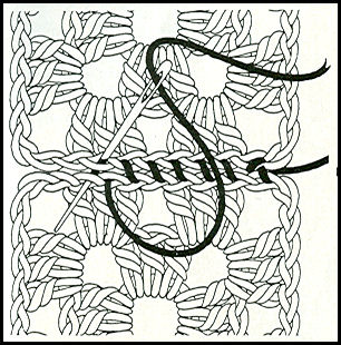 Revenir au bord fermé. Piquer l'aig. entre la 1ère et la 2ème m. end., toujours au pied de la m. du second rang, de l'endroit sur l'envers, pour la ressortir en droite ligne, de l'envers sur l'endroit, entre la 2ème m. end. et la 1ère m. env. suivante. Revenir au bord ouvert, en piquant l'aig. au milieu de la même m. end. (d'où elle est sortie précédemment), de l'end. sur l'env., et la piquer, également, de l'env. sur l'end., au milieu de la m. env. qui suit.
