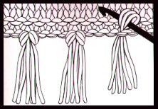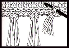 Prendre 6 brins de fil et les plier en deux. Passer la boucle ainsi formée à travers le bord du tricot, passer les extrémités des fils à travers la boucle et tirer fort. Répéter de manière identique le long des extrémités des débuts et des terminaisons de l'écharpe.