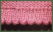 Monter le nombre de mailles nécessaire plus 6 mailles pour la bordure. Travailler en point jersey sur toutes les mailles; mais tous les 2 rangs; sur l'endroit du travail, côté ourlet, glisser la 6ème maille comptée à partir du bord pour former une pliure. Le revêtement terminé, plier la bordure en suivant la maille glissée; la coudre à points coulés. (Bordure pour les devants d'une veste ou d'un manteau non boutonnée)