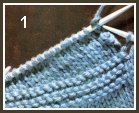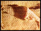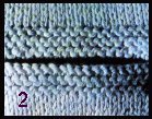 Pour les poches intérieures, tric. d'abord le fond de poche et laisser ces mailles en attente jusqu'à ce que l'on en ait besoin. Calculer le nombre de mailles nécessaires à la largeur de la poche, et monter ce nombre de mailles plus 2. Tricoter en jersey la hauteur nécessaire à la poche. Au dernier rang, diminuer 1 maille de chaque côté et laisser les mailles restantes en attente. Tricoter maintenant le devant du pull ou du cardigan jusqu'à la hauteur prévue pour la poche, moins 4 rangs, en terminant par un rang sur l'endroit du travail (vérifier que le tricot est suffisamment haut pour la hauteur du fond de poche). Revenir sur l'envers du travail, jusqu'aux mailles de l'ouverture de la poche, tricoter ces mailles à l'endroit et terminer le rang. Faire encore 3 rangs en tricotant toujours les mailles de l'ouverture de la poche. Terminer le rang; revenir jusqu'aux mailles rabattues de l'ouverture; placer l'aiguille auxiliaire avec les mailles en attente derrière le travail, l'endroit vers l'avant puis tricoter à l'endroit les mailles du fond de poche à la place des mailles rabattues, terminer ce rang (voir photo 1), puis, continuer sur toutes ces mailles en tricotant encore 4 rangs en point mousse au-dessus de l'ouverture de la poche (voir photo 2). Quand le travail est terminé, coudre soigneusement le fond de poche sur l'envers du travail (voir photo 3).