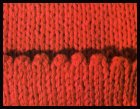 1 m. endr., *faire 1 jeté, tric. 2 m. ens. à l'endr.*. Répéter de * à * jusqu'à la fin de ces mailles, tourner et tricoter encore 5 rangs en jersey uniquement sur les mailles de l'ouverture. Rabattre ces mailles. Couper le fil et le raccorder, sur l'endroit du travail, aux mailles restantes. Terminer le rang. Tricoter jusqu'aux mailles rabattues de l'ouverture, placer l'aiguille auxiliaire avec les mailles en attente du fond de poche devant le travail, l'envers vers soi. Puis, tricoter les mailles du fond de poche dans le point du travail à la place des mailles rabattues. Terminer le rang. Continuer à travailler sur mailles. Ce travail terminé, coudre la patte intérieure sur l'envers du tricot.