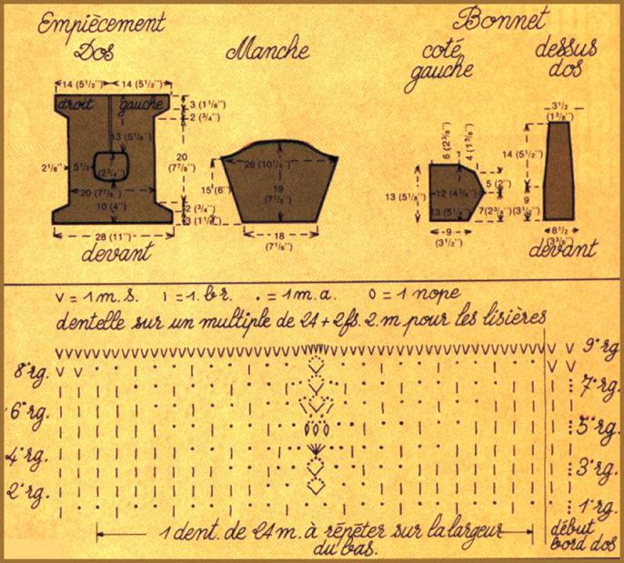 Faire tout autour de la robe, y compris au bord de chaque dent de la dentelle, 1 tour d'arceaux régulièrement répartis, de chacun 7 m.l. et séparés par 1 m.s. faite au bord de la robe, puis, faire un 2ème rg en festonnant les arceaux comme suit: dans chaque arceau faire 2 m.s., 2 m.l., 2 m.s., 2 m.l., 2 m.s., puis 1 m.s. dans la m.s. entre chaque arceau. Border de même le bas des manches. Passer un ruban à l'encolure pour fermer derrière. Passer également un ruban au bas de chaque manche et à la taille, la jupe restant ouverte.