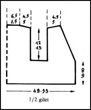 Avec les aig. # 3.5 monter 79 - 83 m., tricoter en point mousse. À 15 - 16 cm de hauteur totale, rabattre à chaque extrémité: 1 fois 25 - 27 m., continuer le travail sur les 29 m. centrales en rabattant 1 m. à chaque extrémité tous les 10 rgs: 4 fois. À 26 - 27 cm de hauteur totale rabattre les 21 m. restantes en 1 seule fois.