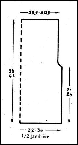Avec les aig. # 2.5 monter 56 - 60 m., tricoter 2 cm de jersey endroit puis continuer avec les aig. # 3.5 en point mousse. À 21 - 23 cm de hauteur totale, pour l'entrejambe, rabattre le 6 m. centrales et continuer chaque côté séparément (on a 25 - 27 m.) pour former les jambières. À 29 - 32 cm de hauteur totale, rabattre.