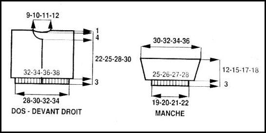 Monter 57 - 61 - 65 - 69 m. tric. 3 cm côtes 1/1 en répart. 9 augm. au dernier rang. Cont. droit point fant. sur les 66 - 70 - 74 - 78 m. obtenues en commençant le 4ème rang:
